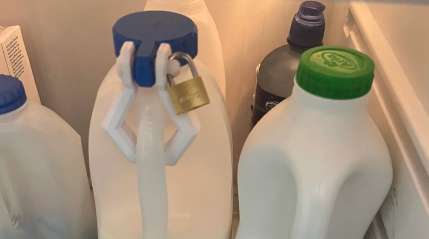 A photo shared on Reddit shows a bottle of milk sitting in a communal office fridge… secured with a padlock.